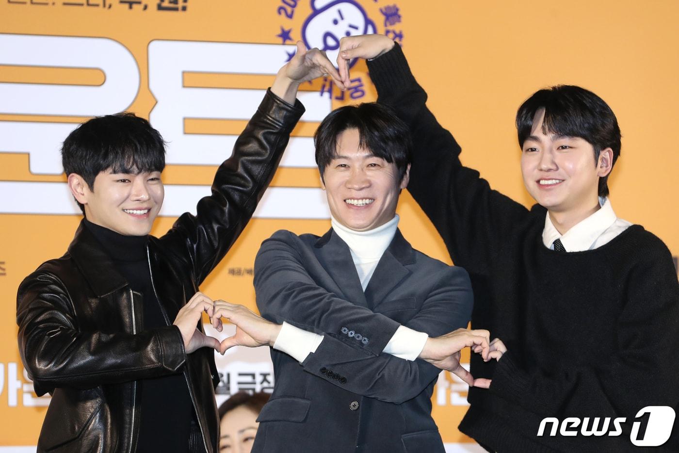배우 장동주(왼쪽부터)와 진선규, 성유빈이 30일 서울 용산구 CGV 용산아이파크몰에서 열린 영화 '카운트' 제작보고회에서 포즈를 취하고 있다. '카운트'는 금메달리스트 출신, 한번 물면 절대 놓지 않는 마이웨이 선생 시헌(진선규 분)이 오합지졸 '핵아싸'(아웃사이더) 제자들을 만나 세상을 향해 유쾌한 한 방을 날리는 이야기를 그린 작품이다. 2023.1.30/뉴스1 ⓒ News1 권현진 기자