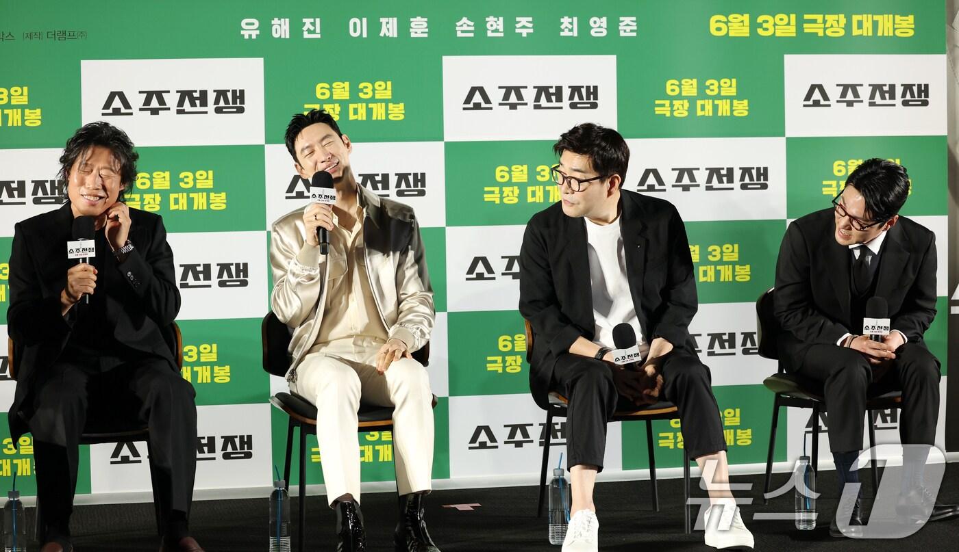[N현장]배우 유해진(왼쪽)과 이제훈(왼쪽 두번째)이 24일 오전 서울 강남구 삼성동 메가박스 코엑스점에서 열린 영화 '소주전쟁' 제작보고회에 참석해 노래를 열창하고 있다. 영화 ‘소주전쟁’은 1997년 IMF 외환위기, 소주 회사가 곧 인생인 재무이사 종록과 오로지 성과만 추구하는 글로벌 투자사 직원 인범이 대한민국 국민 소주의 운명을 걸고 맞서는 이야기를 그린다. 2025.4.24/뉴스1 ⓒ News1 권현진 기자관련 키워드소주전쟁이제훈최영준고승아 기자 한소희·전종서 '프로젝트 Y' 속 금괴 준다…관람 이벤트 개최코르티스, '케데헌' 제작진 신작 애니 '고트' OST 참여주요 기사'개코와 이혼' 김수미 "다시 태어나면 스타와 결혼 NO"슈 "남편 임효성과 싸워 두 달째 연락 안 돼…화해하고 싶어"지상렬, '16세 연하' 신보람과 열애 인정 후 최초 동반 등장논란 여파? '도라이버' 등장 조세호, 수척해진 모습 눈길'비혼모' 사유리, 외국인 '남편들' 깜짝 공개…"AI로"