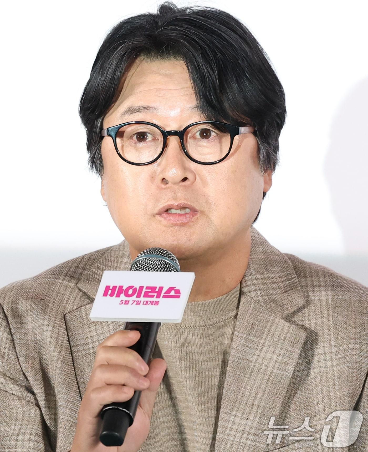 배우 김윤석이 28일 서울 용산구 CGV 용산아이파크몰에서 열린 영화 '바이러스'(감독 강이관) VIP 시사회에 참석해 인사말을 하고 있다. '바이러스'는 이유 없이 사랑에 빠지는 치사율 100% 바이러스에 감염된 택선(배두나 분)이 모쏠 연구원 수필(손석구 분), 오랜 동창 연우(장기하 분), 그리고 치료제를 만들 수 있는 유일한 전문가 이균(김윤석)까지 세 남자와 함께하는 예기치 못한 여정을 그린 작품이다. 2025.4.28/뉴스1 ⓒ News1 권현진 기자