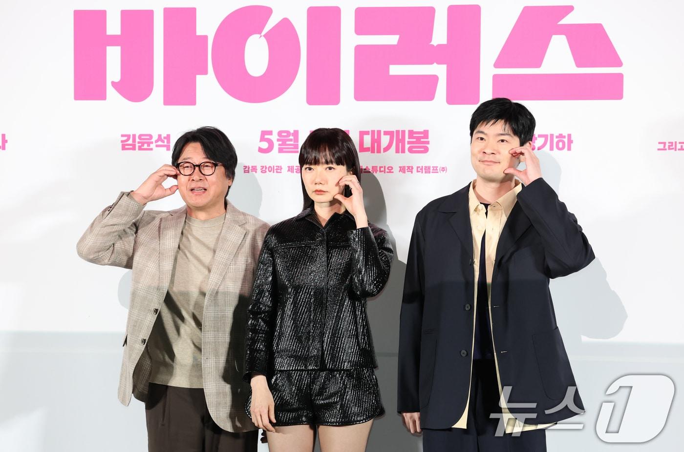 배우 김윤석(왼쪽부터)과 배두나, 장기하가 28일 서울 용산구 CGV 용산아이파크몰에서 열린 영화 '바이러스' VIP 시사회에 참석해 미소를 짓고 있다. '바이러스'는 이유 없이 사랑에 빠지는 치사율 100% 바이러스에 감염된 택선(배두나 분)이 모쏠 연구원 수필(손석구 분), 오랜 동창 연우(장기하 분), 그리고 치료제를 만들 수 있는 유일한 전문가 이균(김윤석)까지 세 남자와 함께하는 예기치 못한 여정을 그린 작품이다. 2025.4.28/뉴스1 ⓒ News1 권현진 기자