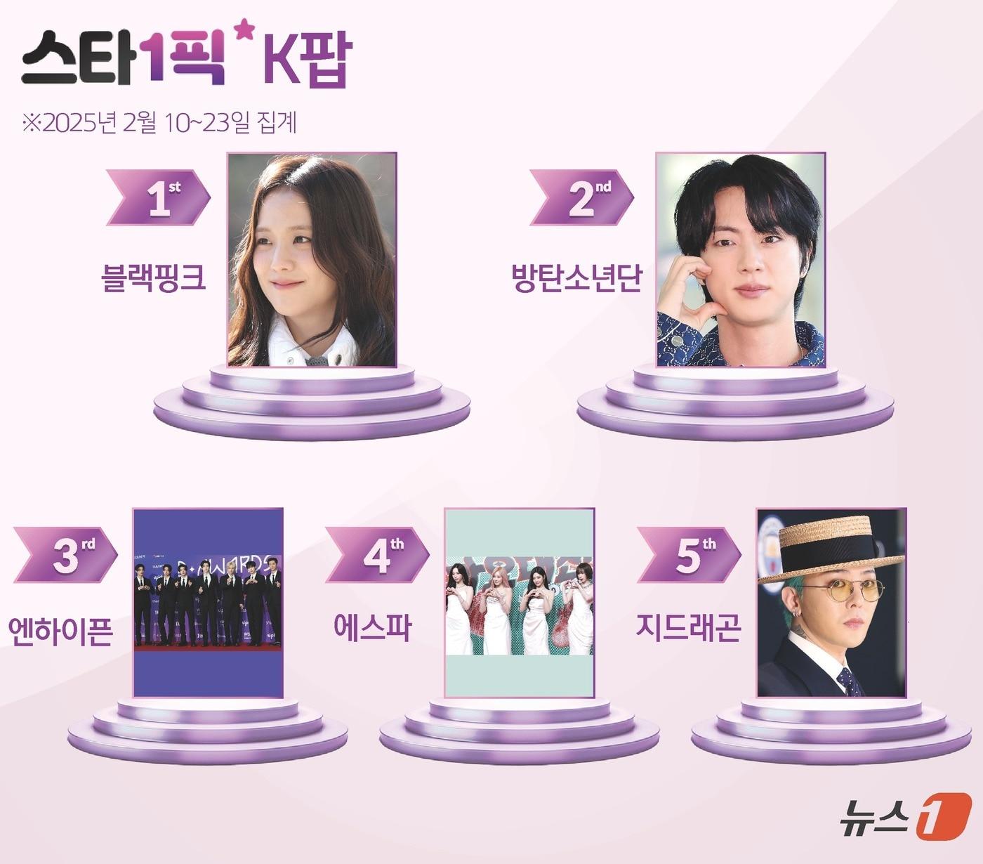 편집자주 ...K팝 아이돌은 어느덧 글로벌 대세로 우뚝 섰습니다. K트로트 가수들 역시 그 어느 때 보다 많은 사랑을 받고 있습니다. 이에 뉴스1은 이들의 생생한 사진, 최신 기사, 화제 동영상을 한 곳에서 만날 수 있는 원스톱 플랫폼 [스타1픽]을 신설했습니다. 뉴스1은 [스타1픽]과 관련해 'K팝 아이돌'과 'K팝 트로트 스타' 중 최근 2주간 가장 많은 관심을 받은 사진의 주인공들을 1~5위까지 소개하는 [스타1픽-K팝] 및 [스타1픽-K트로트] 코너도 마련, 팬들에 최신 정보와 최고의 즐거움을 함께 제공하고자 합니다.