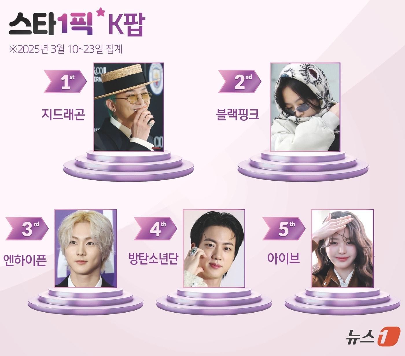 편집자주 ...K팝 아이돌은 어느덧 글로벌 대세로 우뚝 섰습니다. K트로트 가수들 역시 그 어느 때 보다 많은 사랑을 받고 있습니다. 이에 뉴스1은 이들의 생생한 사진, 최신 기사, 화제 동영상을 한 곳에서 만날 수 있는 원스톱 플랫폼 [스타1픽]을 신설했습니다. 뉴스1은 [스타1픽]과 관련해 'K팝 아이돌'과 'K팝 트로트 스타' 중 최근 2주간 가장 많은 관심을 받은 사진의 주인공들을 1~5위까지 소개하는 [스타1픽-K팝] 및 [스타1픽-K트로트] 코너도 마련, 팬들에 최신 정보와 최고의 즐거움을 함께 제공하고자 합니다.