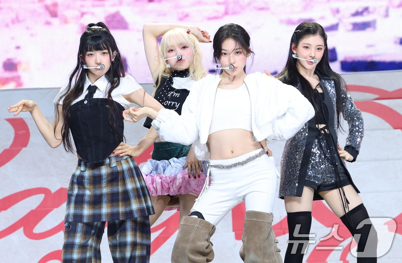 그룹 Baby DONT Cry(베이비돈크라이) 쿠미(왼쪽부터)와 미아, 베니, 이현이 23일 서울 용산구 블루스퀘어에서 가진 데뷔 싱글 'F Girl(에프걸)' 발매 쇼케이스에서 타이틀 곡 ‘F Girl’을 열창하고 있다. 2025.6.23/뉴스1 ⓒ News1 권현진 기자