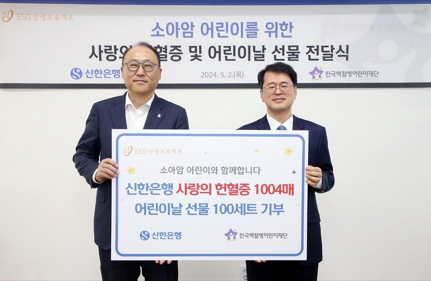 서울시 성북구 소재 한국백혈병어린재단에서 진행한 ‘소아암 어린이를 위한 사랑의 헌혈증 및 어린이날 선물 전달식’에서 신한은행 김기흥 경영지원그룹 그룹장(왼쪽)과 한국백혈병어린이재단 서선원 사무총장이 기념촬영하는 모습./사진제공=신한은행