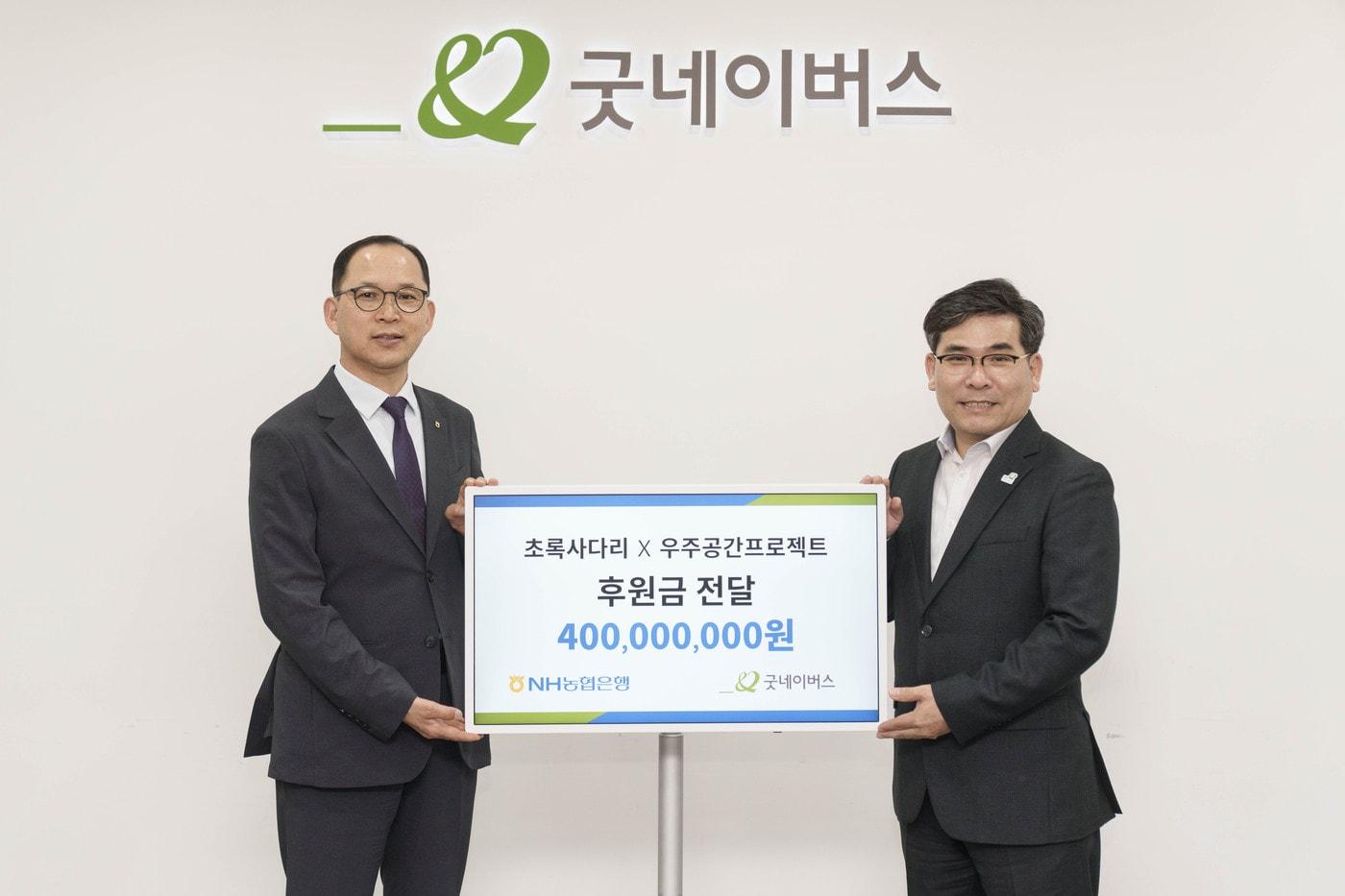 22일 서울 영등포 소재 굿네이버스 회관에서 열린 협약식에서 박병규 농협은행 수석부행장(왼쪽)과 김웅철 굿네이버스 사무총장이 기념촬영을 하고 있다.(농협은행 제공)