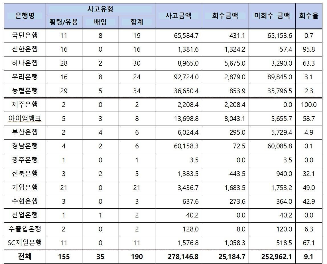 2017년~2024년 8월까지 약 8년간 금융사고 190건사고 금액 2781억원 중 회수액 251억…경남·국민은행 회수율 최저은행별 횡령·유용·배임 금융사고 현황(2017년~2024년 8월). 김현정 의원실 제공.관련 키워드금융사고은행박현영 블록체인전문기자 비트코인, 지금이 저점?…타이거리서치 "목표가 18.5만달러, 상승 여력 충분"[단독]해외 가상자산 거래소, FIU 신고 '수리'돼야 구글플레이 게시 가능관련 기사소상공인 맞춤형 신용평가 개발…금융권 해킹 공격탐지 체계 구축"1등 사수" "1등 탈환"…KB·신한 'AI 금융' 전쟁 막 올랐다진옥동 신한금융 회장 "기업시민 리더 의무 다해야 지속 가능한 일류 신한"NH농협은행 강원본부, 2026년 조기 사업추진 결의대회신한은행 나사카 전국 16개 지방병무청에서도 발급 시작
