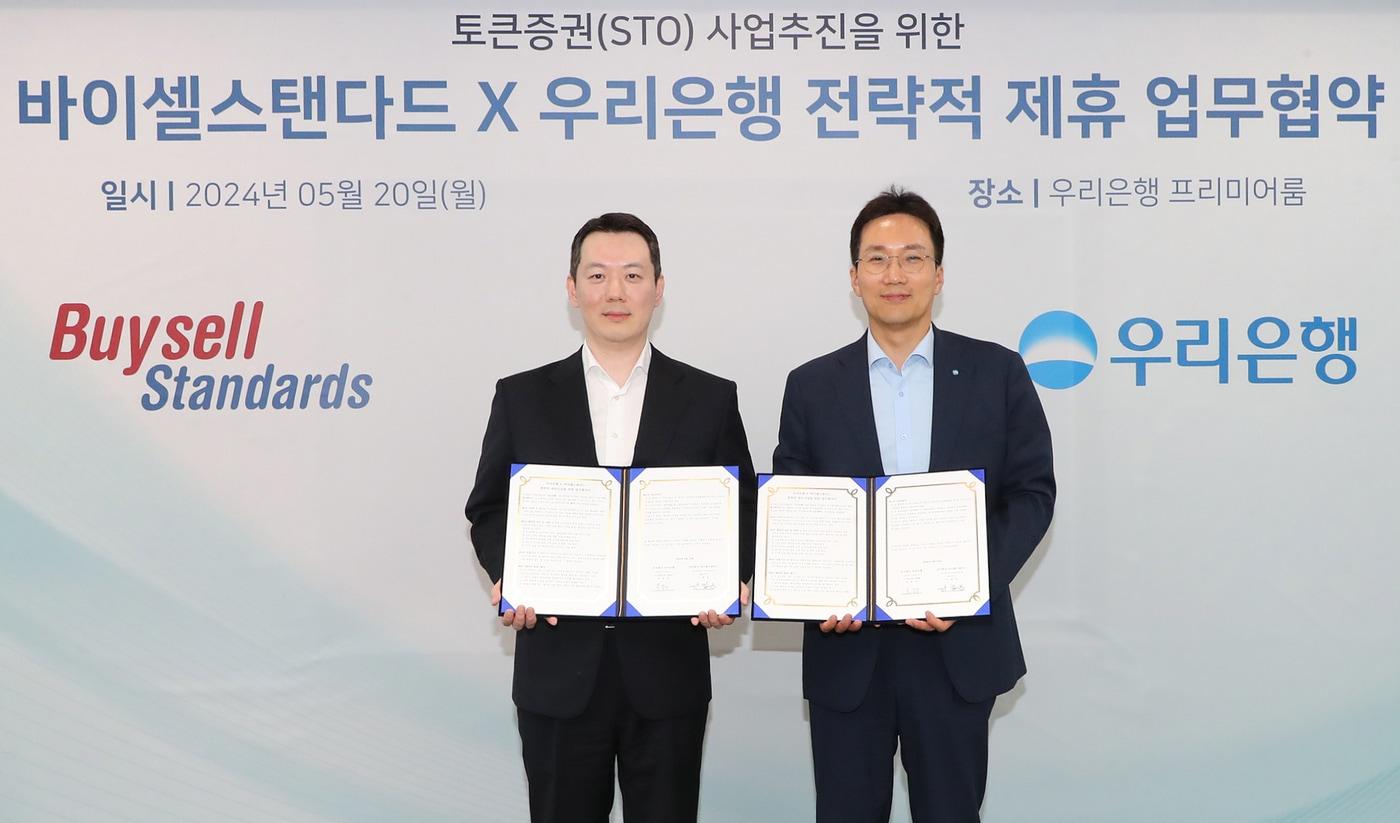 신범준 바이셀스탠다드 대표(왼쪽)와 옥일진 우리은행 디지털전략그룹 부행장이 ‘토큰증권(STO) 서비스 활성화’를 위한 업무협약(MOU) 체결 후 기념촬영을 하고 있다.