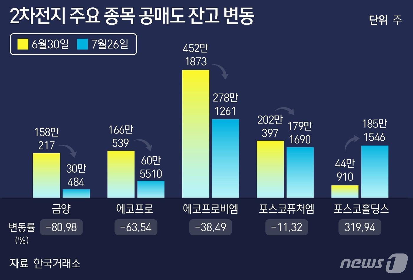 서울 여의도 한국거래소 모니터에 에코프로 주가가 나오고 있다. (다중노출) 2023.7.10/뉴스1 ⓒ News1 이재명 기자관련 키워드7월증시결산공매도숏스퀴즈2차전지증시·암호화폐에코프로포스코홀딩스금양강은성 기자 티웨이 날개 단 소노인터, 재무 안정성 기반 중장기 전략 주목박은지 박사, '스프링거' 통해 단행본 출간…음악+AI 연구성과 인정