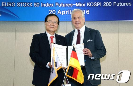 유럽에는 미니코스피200선물 교차 상장 기대 효과최경수 한국거래소 이사장과 제프리 테슬러(Jeffrey Tessler) EUREX 부 CEO가 교차상장 계약을 체결한 뒤 기념촬영을 하고 있다. ⓒ News1
