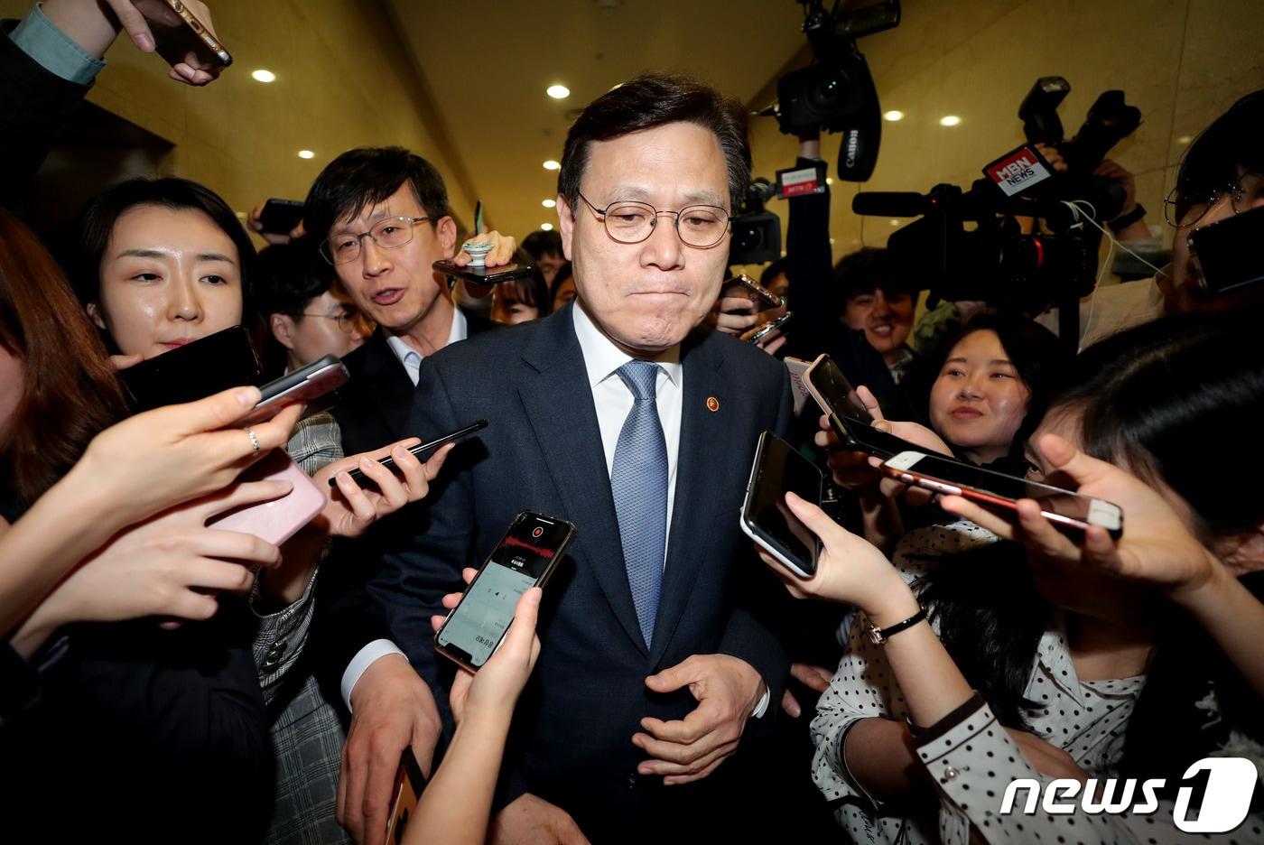 최종구 금융위원장이 15일 오후 서울 중구 은행연합회에서 열린 '성공적인 오픈뱅킹 도입을 위한 향후 과제' 세미나를 마치고 취재진 질문에 답변하고 있다. 2019.4.15/뉴스1 ⓒ News1 이재명 기자