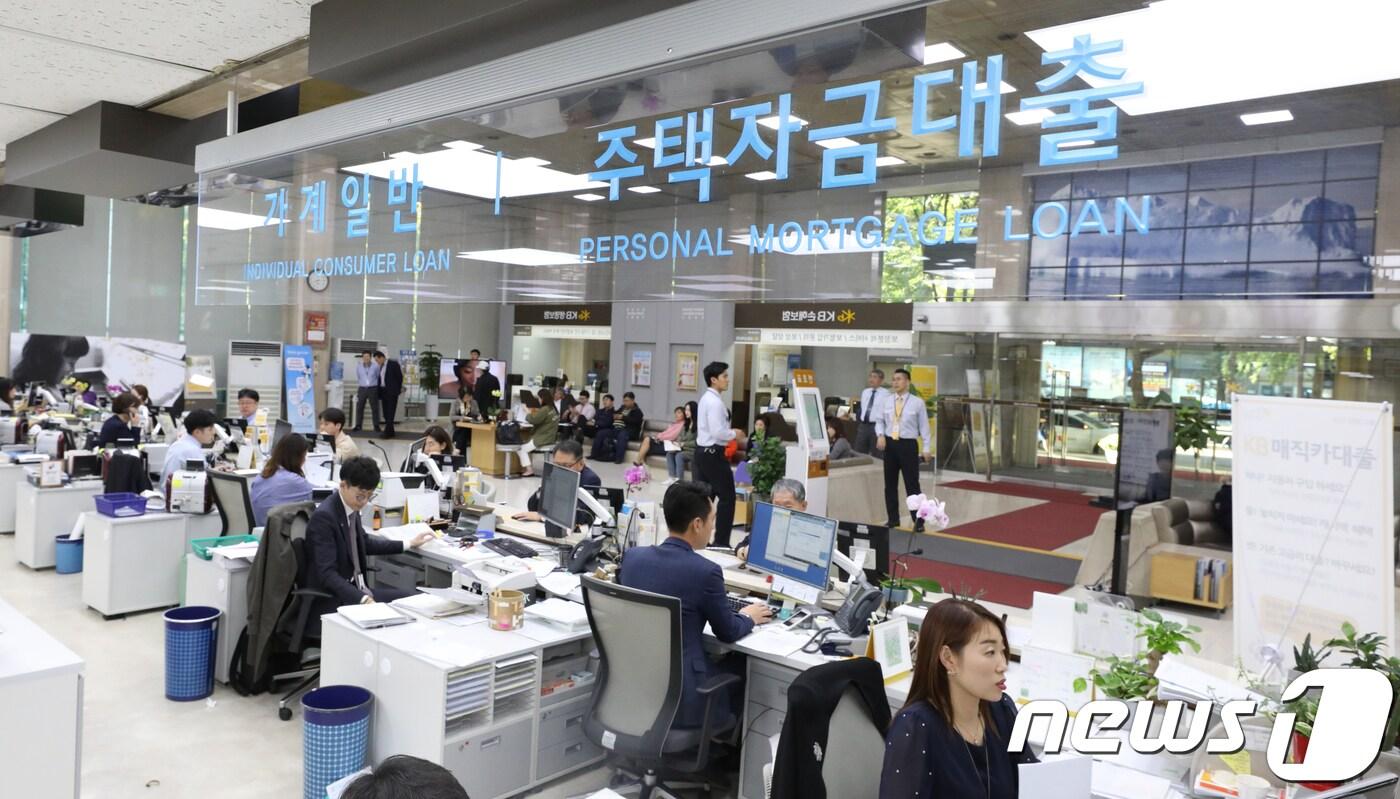 서울 영등포구 국민은행 여의도 영업부에서 직원들이 업무를 보고 있다. (사진은 그래픽프로그램으로 좌우반전) 2017.10.23/뉴스1 ⓒ News1 황기선 기자