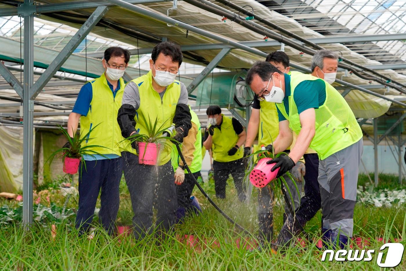 지난 7일, 경기 용인 소재 화훼 농가에서 김광수 회장(왼쪽 2번째) 및 정재영 이사(왼쪽 1번째) 등 농협금융 임직원 봉사단들이 수해를 입은 농가의 신속한 피해복구를 위해 토사 정리 작업을 하고 있다. ⓒ 뉴스1