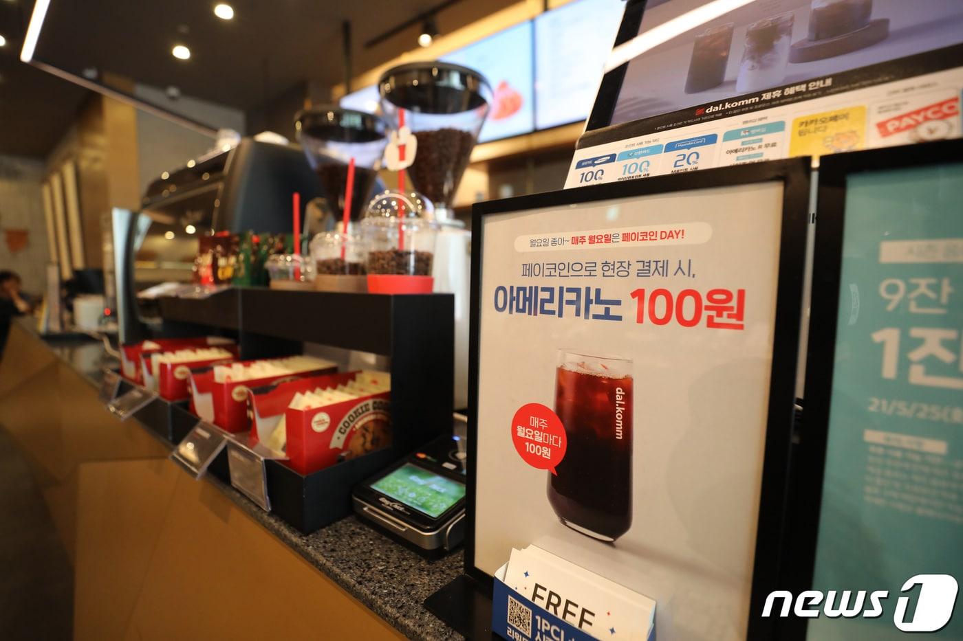 28일 경기도 성남시 분당구 달콤커피 분당서현점에서 페이코인 이용 안내문이 붙어 있다. 2021.6.28/뉴스1 ⓒ News1 박지혜 기자
