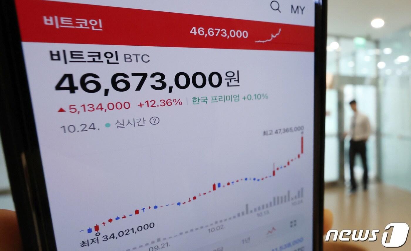 비트코인이 4600만원 선을 돌파해 연고점을 경신한 24일 서울 강남구 빗썸 고객센터에서 고객들이 오가고 있다. 최근 미국 법원이 비트코인 현물 ETF 상장을 반려해온 미국 증권거래위원회(SEC)의 결정을 재검토하라는 판결을 내리면서 상승세에 영향을 미친 것으로 풀이된다. 2023.10.24/뉴스1 ⓒ News1 김민지 기자