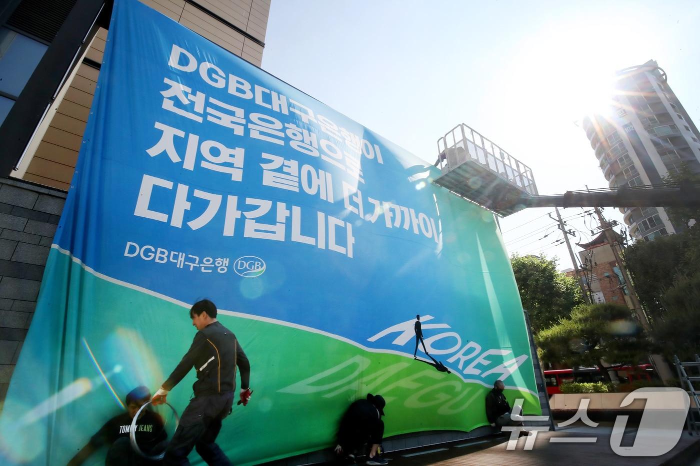 16일 오후 대구 수성구 대구은행 본점 앞 열린광장에서 현수막업체 관계자들이 '대구은행의 시중은행 전환 인가'를 축하하는 현수막을 설치하고 있다. 2024.5.16/뉴스1 ⓒ News1 공정식 기자