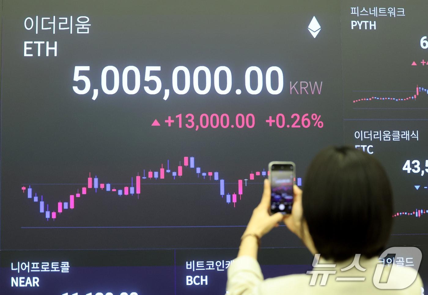 대장주 비트코인이 9700만원대로 급등한 21일 서울 강남구 업비트 고객센터 전광판에 이더리움 가격이 표시되고 있다. 이날 급등은 시가총액 2위 이더리움 현물 상장지수펀드(ETF)가 미 증권거래위원회(SEC)의 승인을 받을 수 있다는 낙관론에 따른 것으로 분석된다. 2024.5.21/뉴스1 ⓒ News1 박지혜 기자