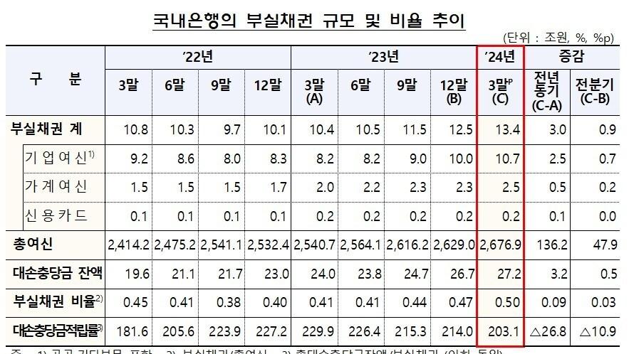 신규 부실채권 줄었으나, 부실채권 정리규모도 함께 감소"신용손실 확대 가능성…손실흡수능력 강화 유도"(금융감독원 제공)관련 키워드부실채권국내은행규모정리부실채권정리김근욱 기자 금융기관 '효율적 소통' 강조한 이억원…생산적 금융 확대 강조(종합)이억원 "주택연금 매년 감소" 지적에…주금공 "자녀들에게 물려주느라"관련 기사은행권 10월 대출 연체율 0.58%…전월 대비 0.07%p 상승은행권 9월 대출 연체율 0.51%…전월比 0.1%p 하락은행권 부실채권 비율 소폭 개선…9월말 기준 0.57%10월 국채 금리 상승…"금리 인하 기대감 후퇴 영향"배드뱅크 골머리 앓는 은행권…3600억 분담 두고 회의서 '격론'