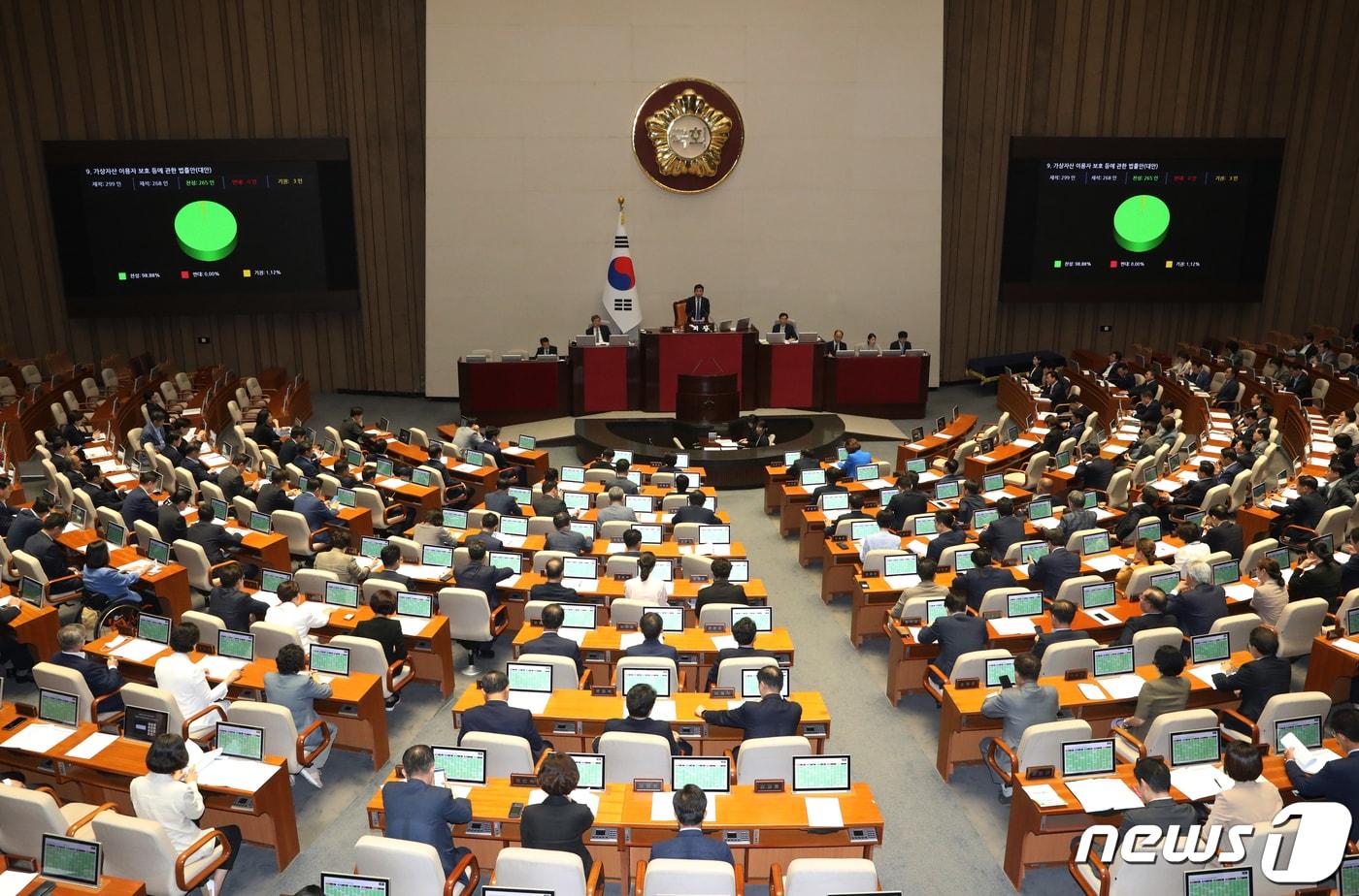 30일 오후 서울 여의도 국회에서 열린 제407회 국회(임시회) 제7차 본회의에서 가상자산 이용자 보호 등에 관한 법률안이 통과되고 있다. 2023.6.30/뉴스1 ⓒ News1 송원영 기자