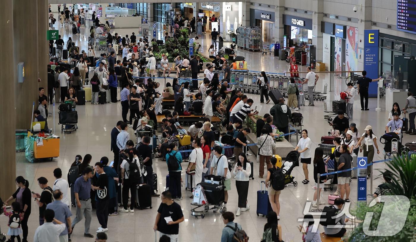 추석 연휴 마지막 날인 18일 오후 인천국제공항 제1터미널 입국장이 해외 여행에서 돌아오는 여행객들로 붐비고 있다. 2024.9.18/뉴스1 ⓒ News1 김진환 기자