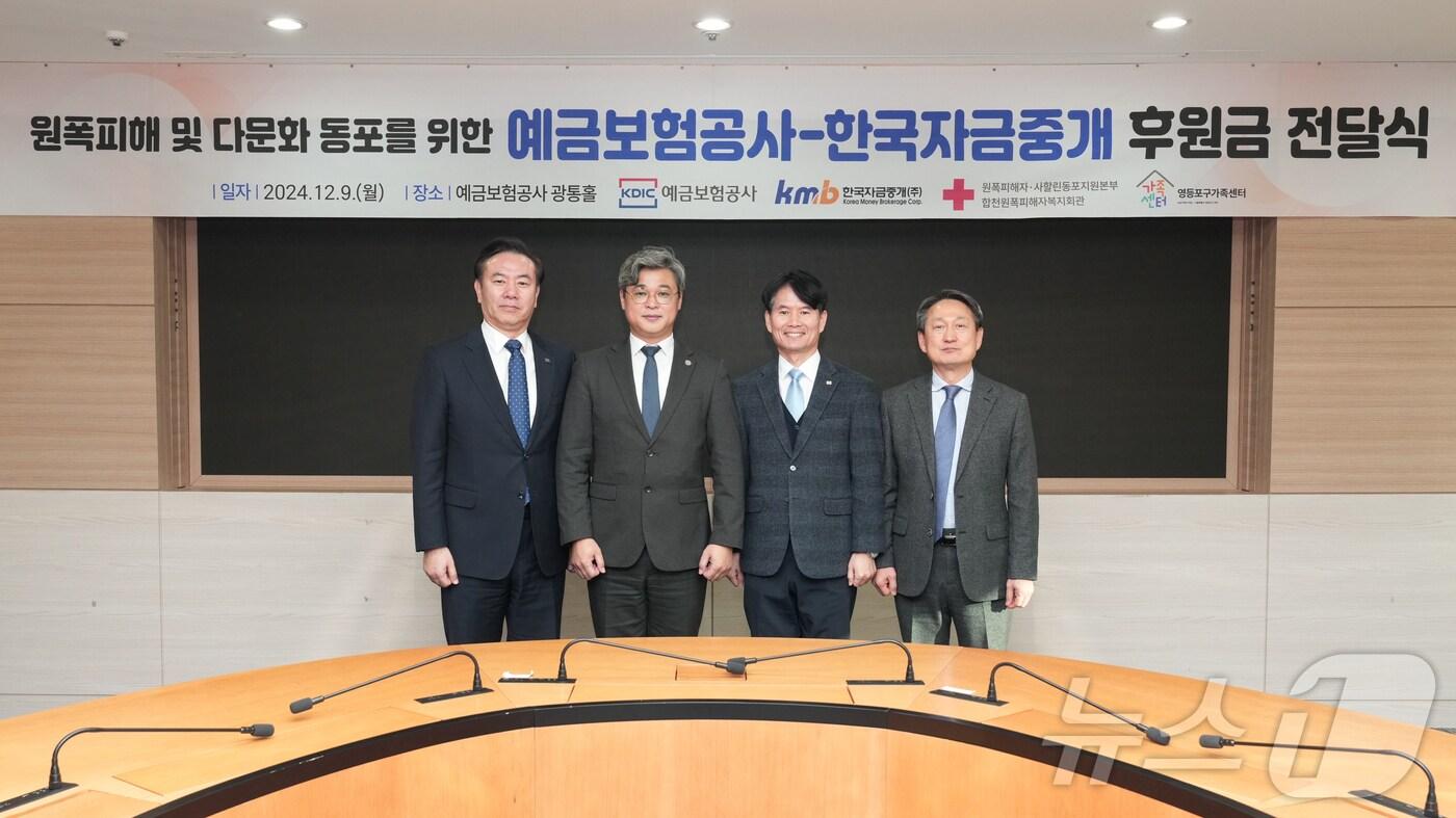 9일 서울 중구 소재 예금보험공사에서 열린 후원금 전달식'에서 유재훈 예금보험공사 사장(왼쪽부터), 정수원 합천원폭피해자복지회관 관장, 강현덕 영등포구가족센터장, 우해영 한국자금중개 사장이 기념사진을 촬영하고 있다.