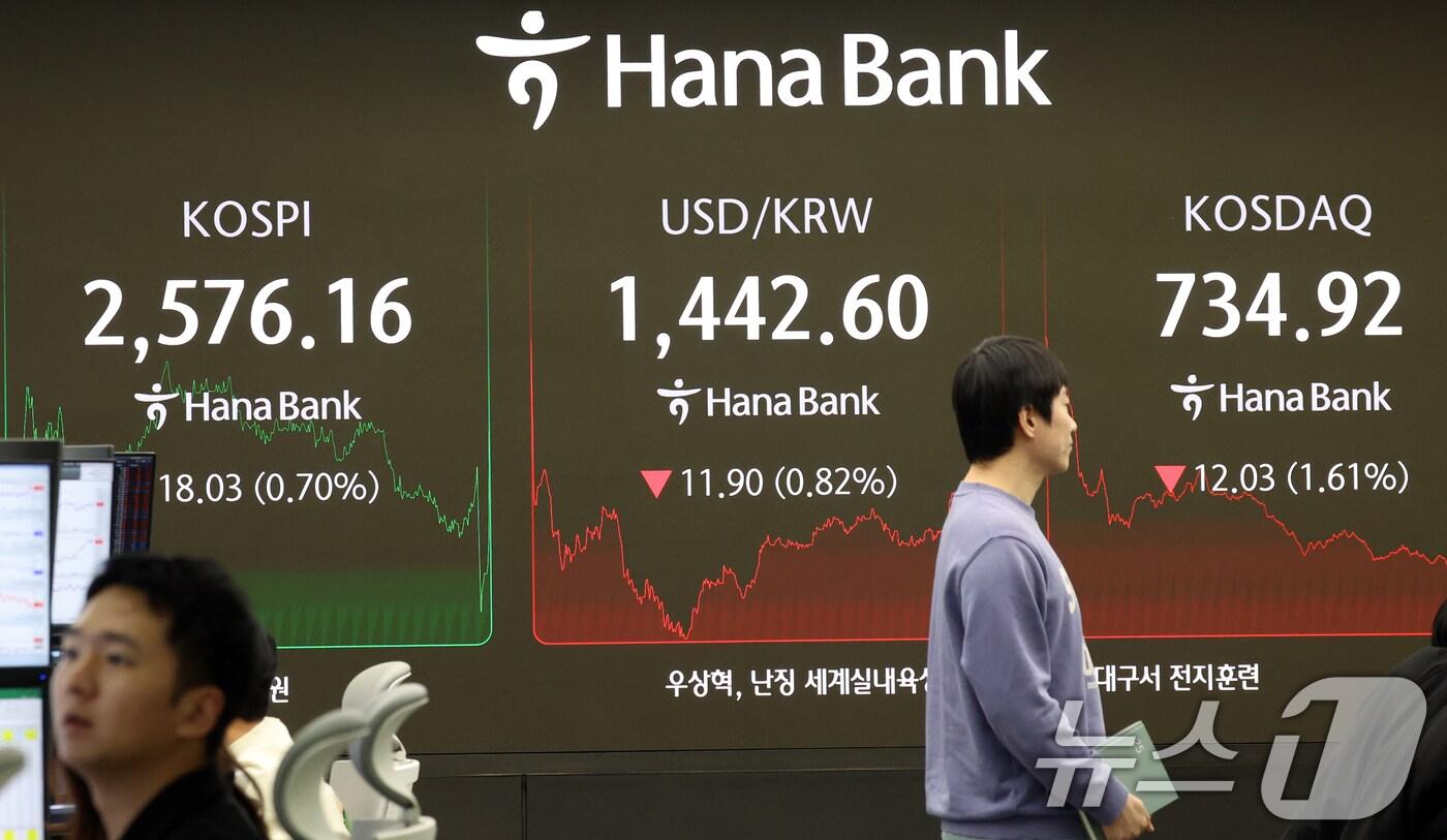 6일 오후 서울 중구 하나은행 본점 딜링룸 전광판에 시황과 원달러 환율이 표시되고 있다. 2025.3.6/뉴스1 ⓒ News1 김명섭 기자