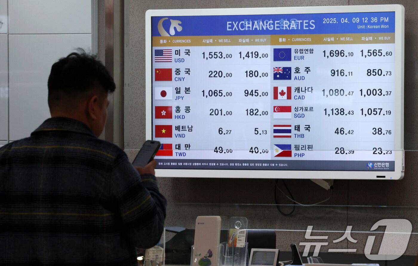 9일 오후 서울 강서구 김포공항 국제선청사 환전소에 원달러 환율을 비롯한 환율 시세가 나타내고 있다. 2025.4.9/뉴스1 ⓒ News1 박세연 기자