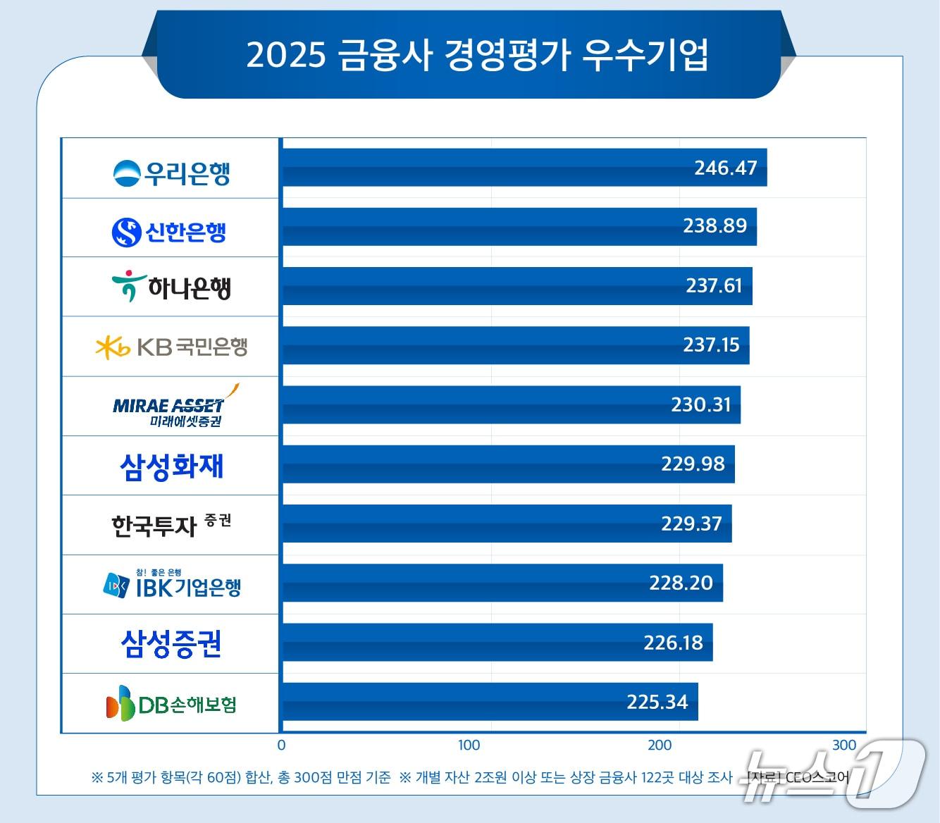 CEO스코어, 금융사 122곳 대상 경영평가…우리은행 종합 1위신한·하나·KB국민銀 2~4위…여신사·저축은행 '톱10' 못 올라(CEO스코어 제공)관련 키워드미래에셋증권삼성화재해상보험한국투자증권삼성증권한화생명보험김재현 기자 '일타' 현우진 "현직교사와 문항거래 맞지만 수급채널 중 하나일 뿐"'군인 자녀 학교' 한민고, 공립화 추진…교육부·국방부·경기교육청 MOU관련 기사"자사주 1년內 소각"…상법 개정안 발의에 금융주 '들썩'[핫종목]금융업 상장사, 첫 XBRL 주석 제출 완료…"외국인 투자자 접근성 강화"삼성생명, 화재 편입에 7% 껑충…'밸류업' 타고 금융주 들썩[핫종목]