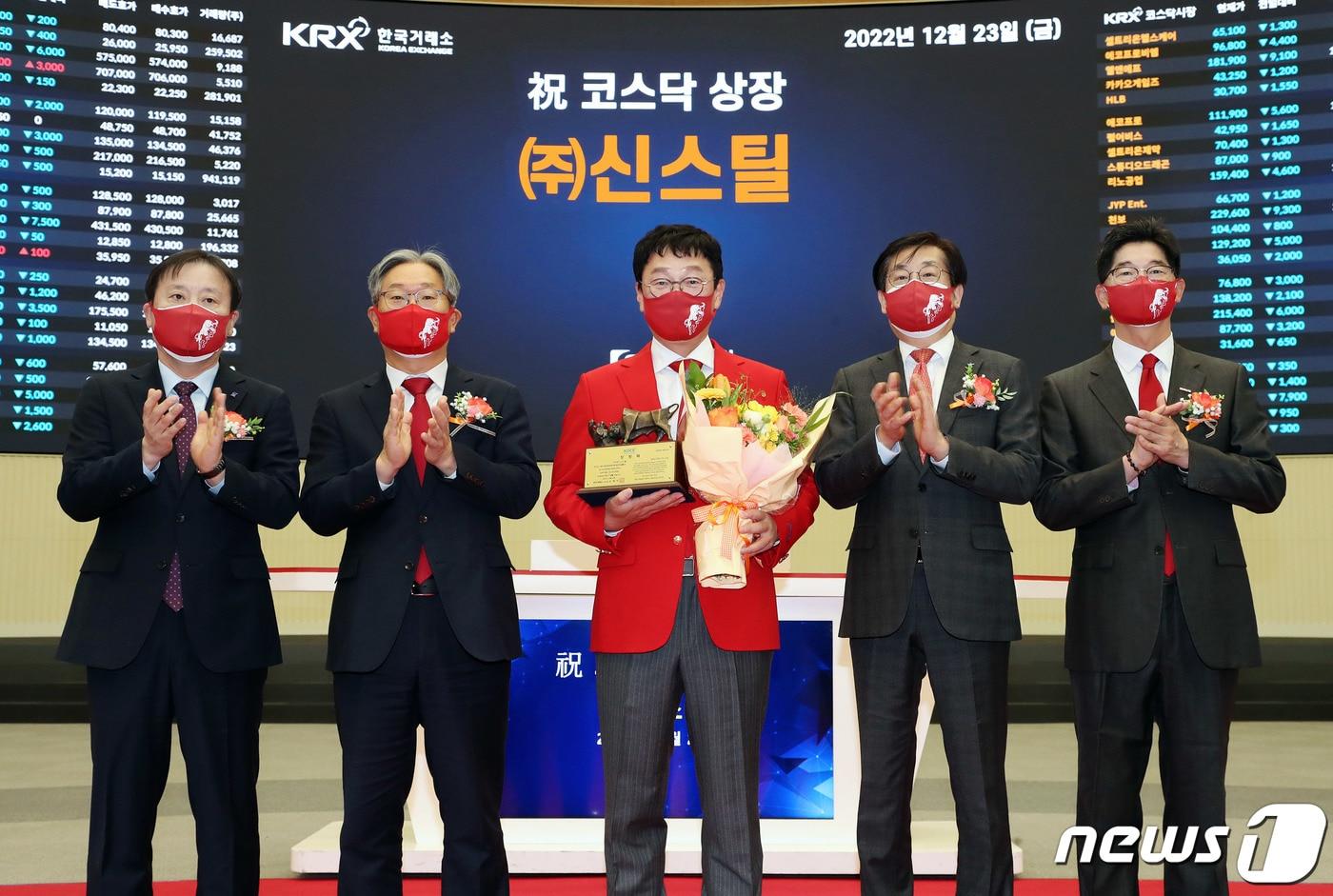 23일 오전 서울 영등포구 한국거래소에서 열린 신스틸 코스닥시장 상장기념식에서 상장기념패 전달 후 유도석 한국IR협의회 상무(왼쪽부터), 홍순욱 한국거래소 코스닥시장본부장, 신승곤 신스틸 대표이사, 박병기 하나증권 본부장, 김준만 코스닥협회 이사가 기념촬영을 하고 있다. (한국거래소 제공) 2022.12.23/뉴스1