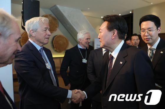 윤석열 대통령과 만남 여부에 관심윤석열 대통령이 지난 1월18일 오후(현지시간) 스위스 다보스의 한 호텔에서 제이미 다이먼(Jamie Dimon) 제이피모건 체이스(JPMorgan Chase) CEO와 악수하고 있다. (대통령실 제공) 2023.1.20/뉴스1관련 키워드증시·암호화폐관련 기사한국거래소, 프리·애프터마켓 개설…내년 12월부터 24시간 거래(종합)한국서 절반 이상 거래…스토리, 이틀 새 61% 폭등[특징코인]국힘, 14일 가상자산 2단계 입법 간담회…'거래소 지분 제한 논란' 도마위지정학적 긴장 고조에…방산·조선株, 신고가 속출[핫종목]2차전지株 날았다…포스코홀딩스 14%·LG화학 7% 급등[핫종목]