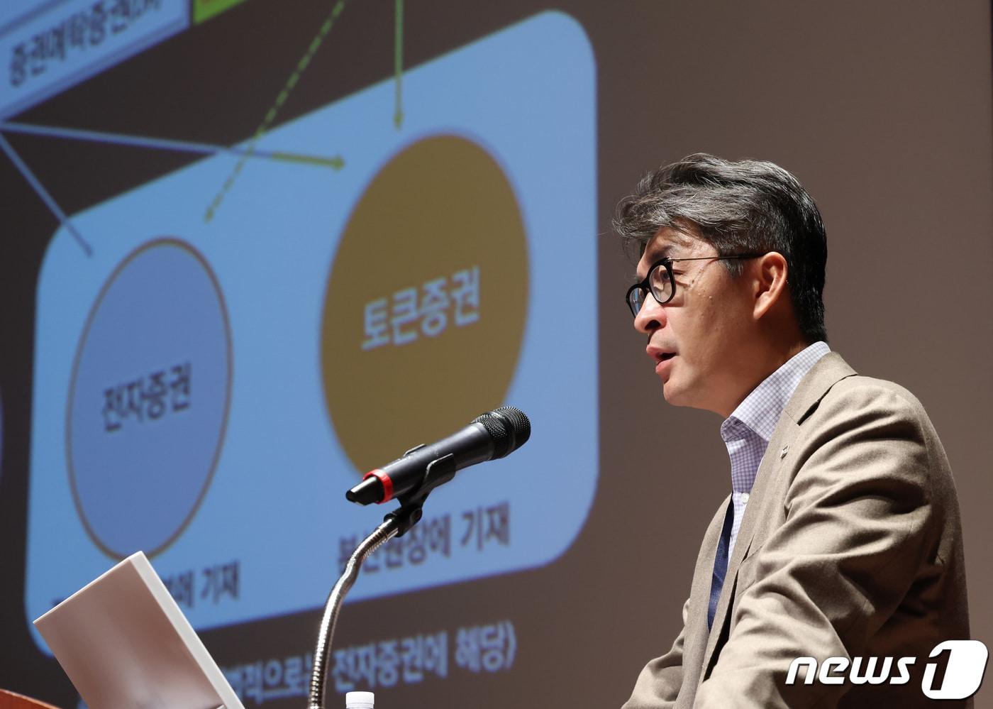 안인성 미래에셋증권 디지털부문 대표가 26일 서울 여의도 한국거래소 컨퍼런스홀에서 열린 '뉴스1 투자포럼(NIF) 2023'에서 토큰 증권을 주제로 강연하고 있다.2023.10.26/뉴스1 ⓒ News1 김민지 기자
