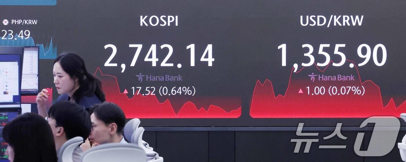 20일 서울 중구 하나은행 딜링룸 전광판에 코스피 지수가 전일 대비 17.52 포인트(0.64%) 상승한 2,742.14를, 원·달러환율은 1.00원(0.07%) 상승한1,355.980원을 나타내고 있다. 이날 코스피는 외인·기관 투자자의 매수세에 힘입어 소폭 상승하며 장을 마감했다. 2024.5.20/뉴스1 ⓒ News1 민경석 기자문혜원 기자 '외인·기관 쌍끌이' 삼성전자, 사상 최고가…'15만전자' 눈앞[핫종목]"오늘도 올랐다"…코스피 11거래일 연속 최고치, '시총 첫 4000조' 돌파 [시황종합]