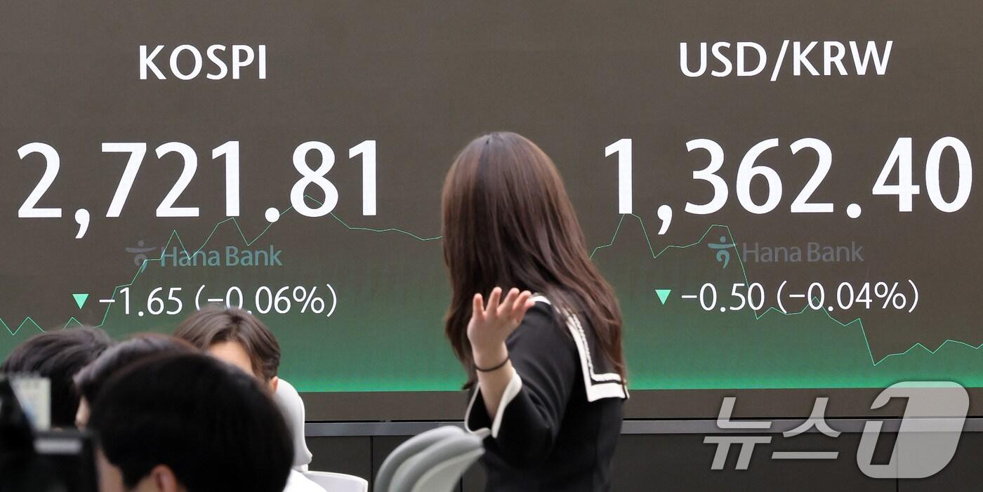 23일 오후 서울 중구 하나은행 딜링룸에서 직원이 업무를 보고 있다. 이날 코스피는 전날 대비 1.65포인트(p)(0.06%) 하락한 2721.81, 코스닥은 0.86p(0.10%) 상승한 846.58로 장을 마쳤다. 원·달러 환율은 전날보다 0.5원 내린 1362.4원으로 마감했다. 2024.5.23/뉴스1 ⓒ News1 이동해 기자