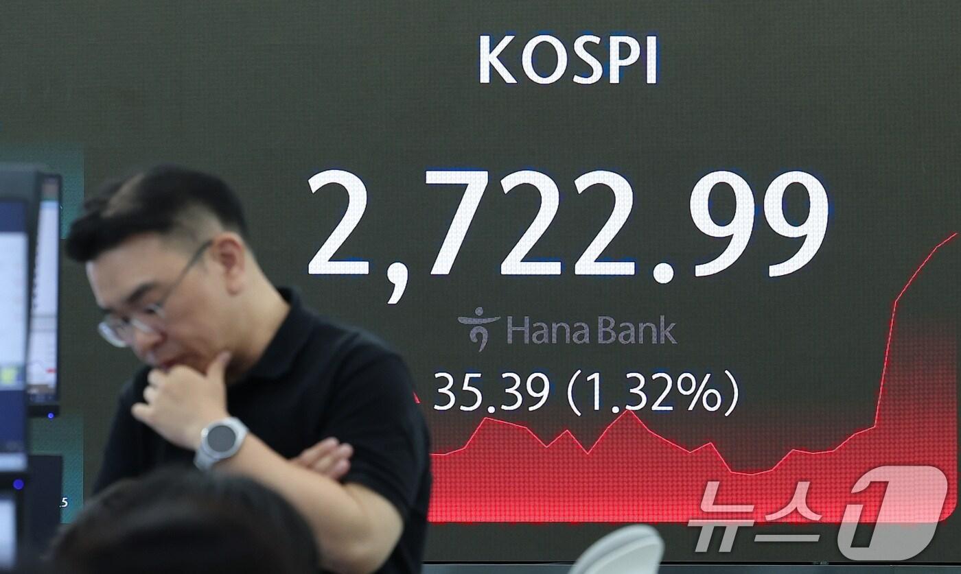 27일 오후 서울 중구 하나은행 딜링룸에서 직원이 업무를 보고 있다. 이날 코스피는 전날 대비 35.39포인트(p)(1.32%) 상승한 2722.99, 코스닥은 8.58p(1.02%) 상승한 847.99로 장을 마쳤다. 원·달러 환율은 전날보다 5.7원 내린 1363.8원으로 거래를 마쳤다. 2024.5.27/뉴스1 ⓒ News1 김성진 기자