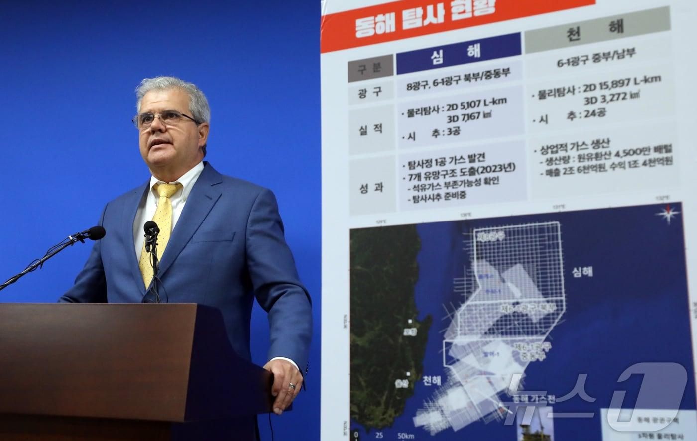 비토르 아브레우 미국 액트지오사 고문이 7일 오전 세종시 정부세종청사 산업통상자원부 기자실에서 동해 심해 가스전 개발 관련 기자회견을 하고 있다. 아브레우 고문은 경북 포항 영일만 일대에 최대 140억배럴 규모의 석유·가스가 매장돼 있을 가능성이 있다고 분석했다. 2024.6.7/뉴스1 ⓒ News1 김기남 기자관련 키워드화성밸브한국석유공업금호석유화학흥구석유한국가스공사SK가스한국투자ANKOR유전해외자원개발특별자산투자회사1호(지분증권)동양철관김정현 기자 "소버린 AI 원조" 네이버, '국대 AI' 1차 탈락…거센 후폭풍네이버, 한화생명 e스포츠 프로게임단 스폰서십 계약 체결