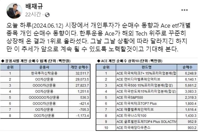 한투운용 ACE ETF, 수익률 상위 1~4위 독식배재규 한국투자신탁운용 대표 SNS관련 키워드한국투자신탁배재규ETFACE신건웅 기자 "홈플러스 운영 중단 막자"…MBK, 긴급운영자금 대출 1000억 부담이지스운용 "센터필드 매각 예정대로…신세계 주장은 부당한 간섭"관련 기사배재규 한투운용 사장 "버블 신경 쓰지 마라…성공 투자는 방향·시간"한투운용, CUAM과 홍콩 ETF 시장 진출 위한 협력 계약 체결배재규 한투운용 사장 "'AI 버블' 아직 아냐…위기에도 안 망할 기업 찾아야"한투운용 "급락장서도 TDF는 걱정 없다…전략적 자산 분배 필요""배재규 통찰 통했다"…한투신탁 ACE ETF, 순자산액 20조 돌파