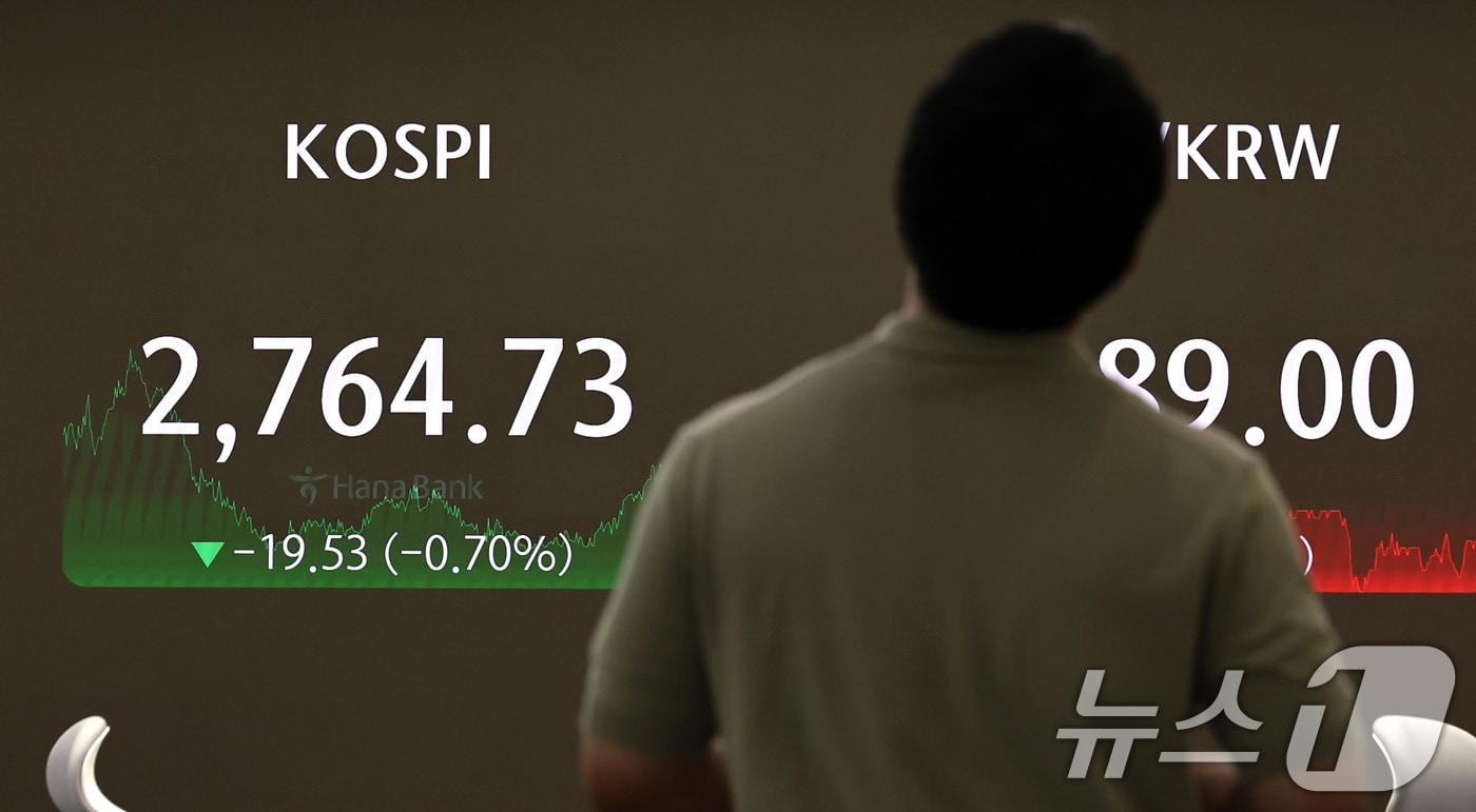 24일 오후 서울 중구 하나은행 본점 딜링룸 전광판에 코스피 종가가 전 거래일 대비 19.53포인트(0.7%) 하락한 2764.73을 나타내고 있다. 2024.6.24/뉴스1 ⓒ News1 구윤성 기자