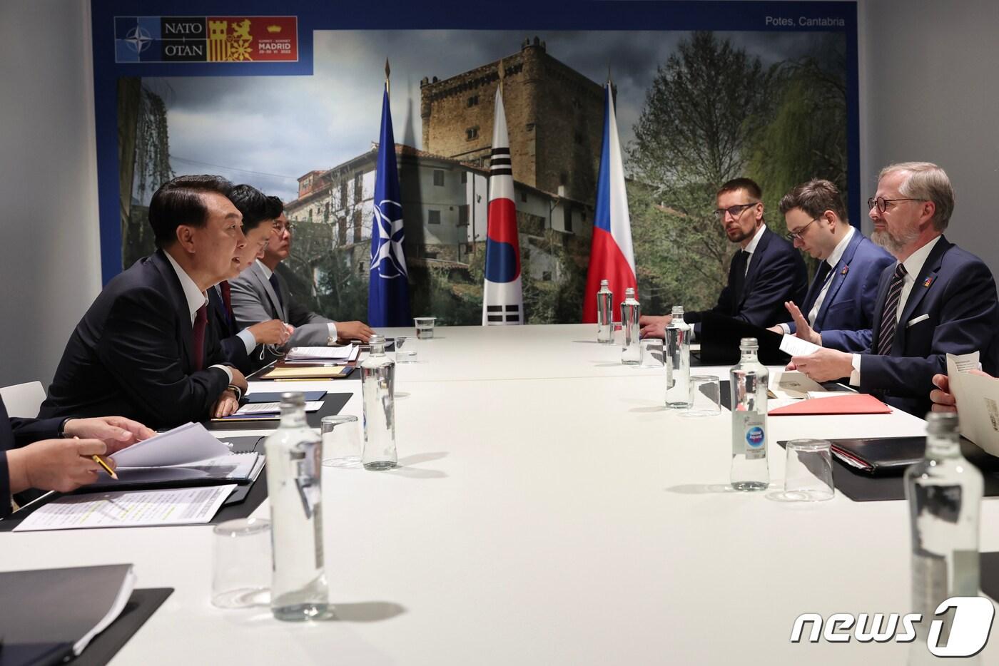 내주 체코원전 우선협상대상자 발표…한전산업 8% 등 상승세윤석열 대통령이 30일 오전(현지시간) 스페인 마드리드 이페마(IFEMA) 컨벤션센터에서 페트르 피알라 체코 총리와 정상회담을 하고 있다. (대통령실사진기자단) 2022.6.30/뉴스1 ⓒ News1 오대일 기자관련 키워드한전산업개발엘에스일렉트릭효성중공업대우건설두산에너빌리티