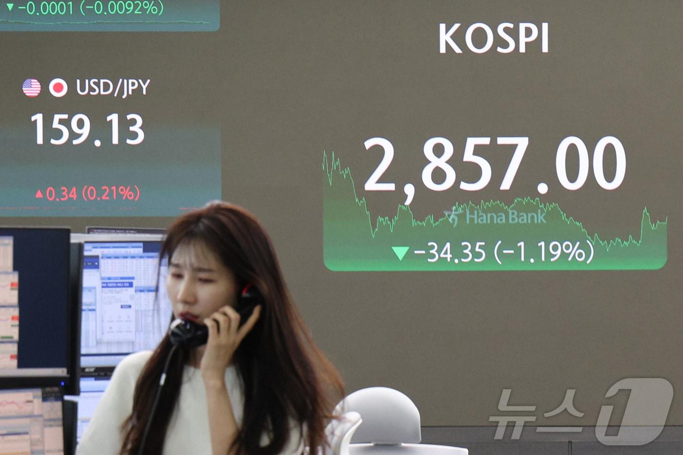 12일 오후 서울 중구 하나은행 딜링룸 전광판에 코스피 지수가 2,857.00을 나타내고 있다. 이날 코스피는 외국인 매도세가 강해지며 전날대비 34.35포인트(1.19%) 하락했다. 2024.7.12/뉴스1 ⓒ News1 조유리 기자