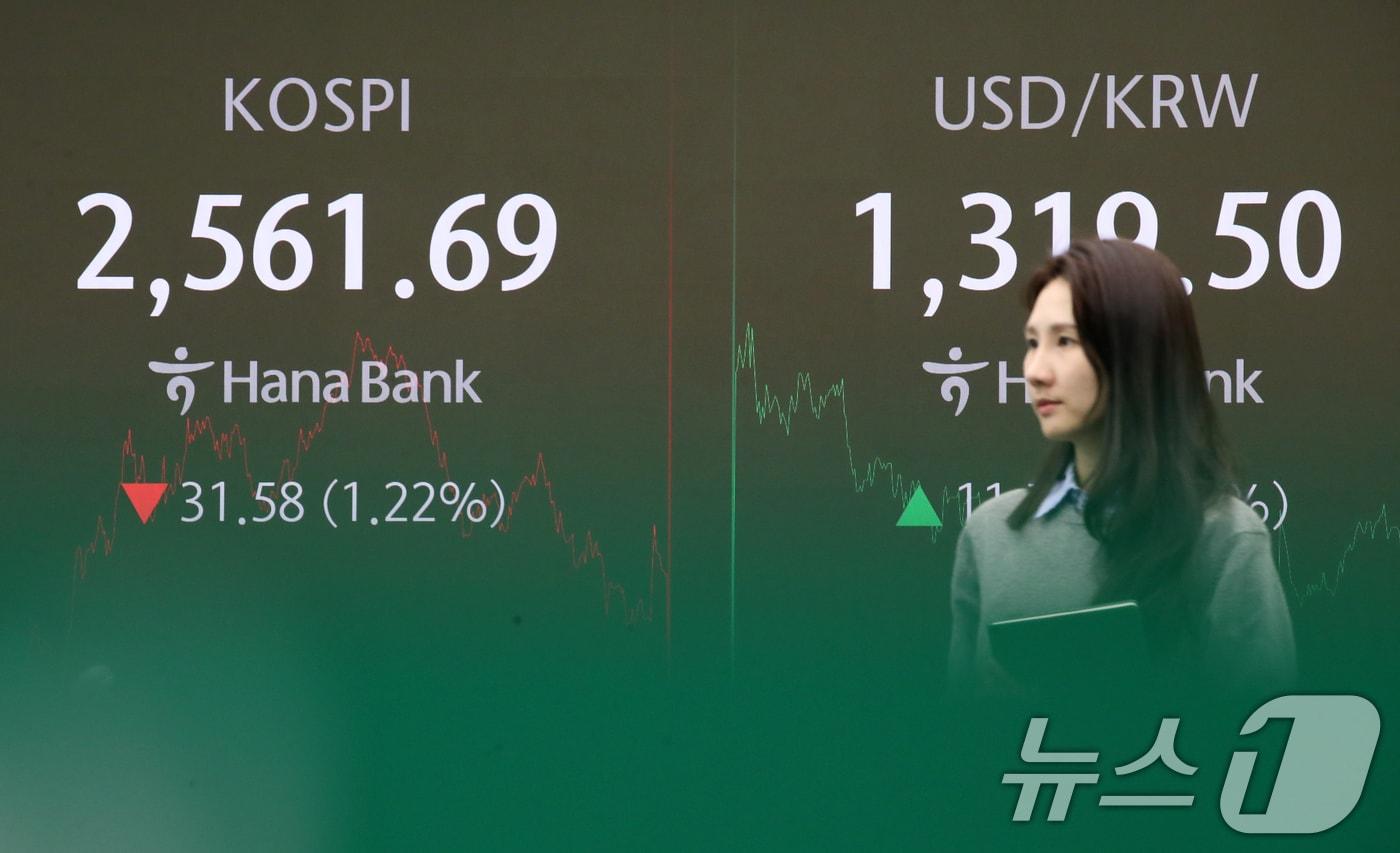 2일 오후 서울 중구 하나은행 딜링룸 전광판에 종가가 표시되고 있다. 이날 코스피 지수는 전 거래일 대비 31.58p(1.22%) 내린 2,561.69, 코스닥 지수는 1.75p(0.23%) 내린 762.13으로 장을 마감했다. 달러·원 환율은 오후 세 시 삼십분 기준 11.7원 오른 1,319.5원을 기록하고 있다. 2024.10.2/뉴스1 ⓒ News1 이승배 기자