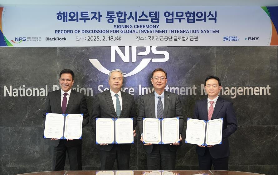 주문관리·포트폴리오 관리 일원화…해외투자 전용망도 설치서원주(사진 왼쪽에서 세 번째) 국민연금공단 기금운용본부장은 18일 오후 전북특별자치도 전주시 소재 기금운용본부에서 열린 해외투자 통합시스템 업무협의식에 참석해 서명했다. (왼쪽부터) BNY멜론 로한 싱 대표, 블랙록 히로 시미즈 대표, 서원주 기금운용본부장, 스테이트스트리트은행(SSBT) 김민 대표(사진=국민연금공단)