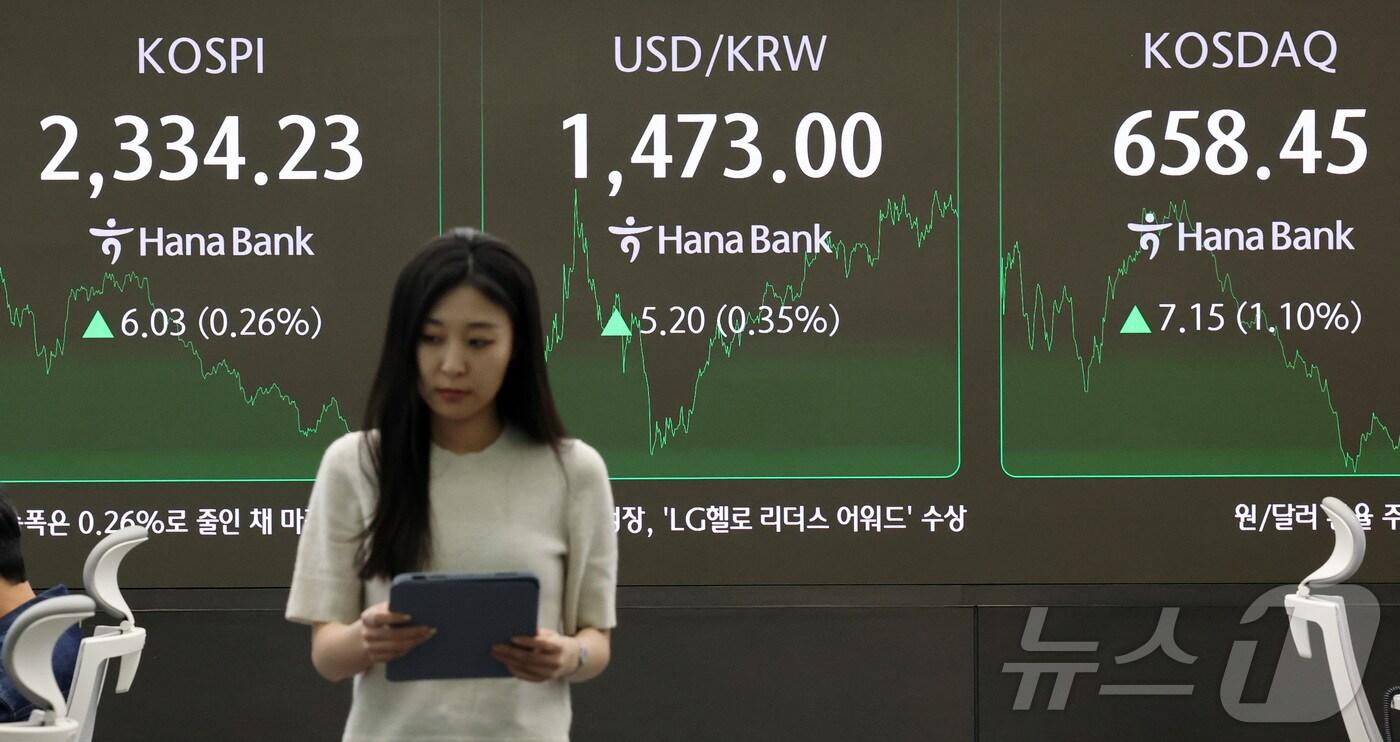 8일 서울 중구 하나은행 딜링룸 전광판에 종가 현황이 표시돼 있다./뉴스1 ⓒ News1 박세연 기자