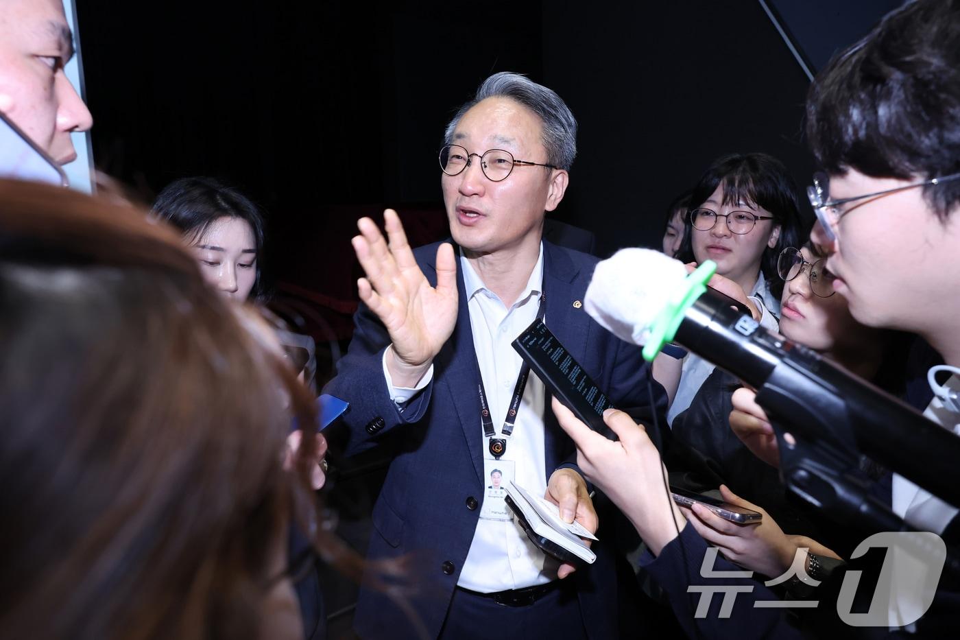 안병철 한화에어로스페이스 전략총괄 사장이 8일 오전 서울 중구 장교동 한화 그룹 본사에서 열린 '한화에어로 미래 비전 설명회'에서 중장기 투자 계획 및 최근 유상증자 관련 입장 발표를 마친 뒤 취재진의 질문을 받고 있다. 2025.4.8/뉴스1 ⓒ News1 민경석 기자