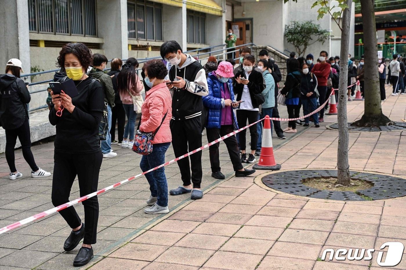 12일(현지시간) 오미크론 변이 확산으로 홍콩의 코로나19 검사소에 주민들이 줄을 서서 검사를 기다리고 있다. ⓒ AFP=뉴스1 ⓒ News1 우동명 기자