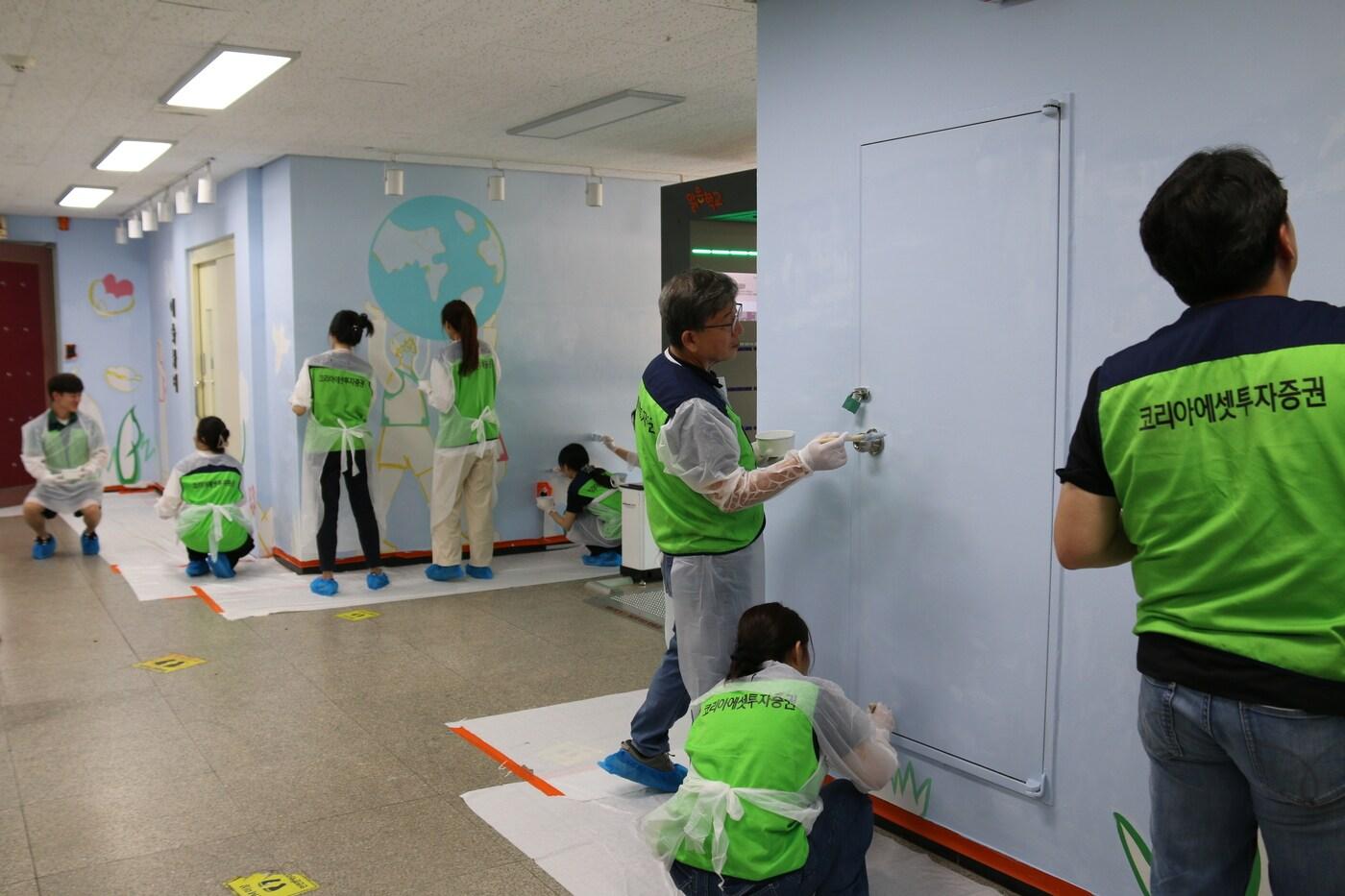 코리아에셋투자증권 임직원들이 9일 양화초등학교에서 벽화 그리기 나눔활동을 진행하고 있다.(코리아에셋투자증권 제공)