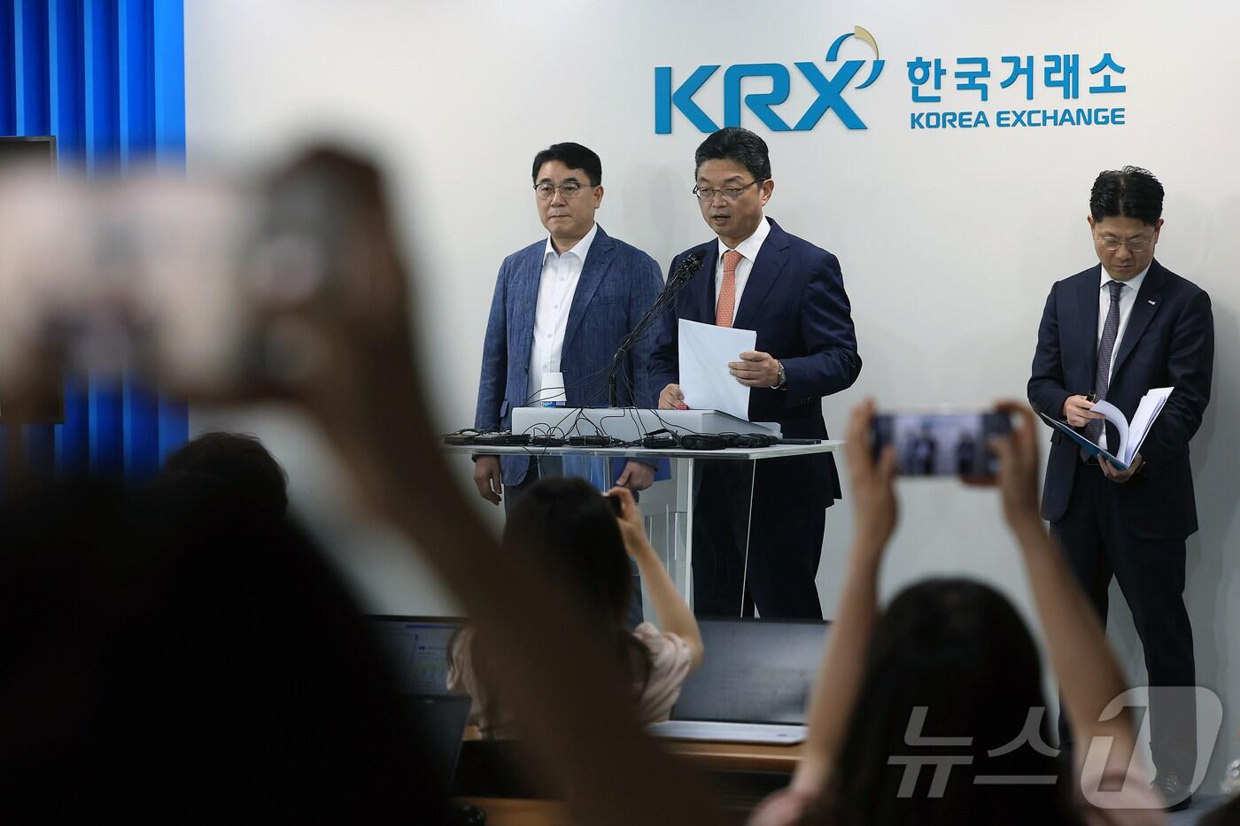 이윤수 증권선물위원회 상임위원이 9일 오전 서울 여의도 한국거래소 브리핑룸에서 자본시장 불공정거래 근절 실천방안 합동브리핑을 하고 있다. 왼쪽부터 이승우 금융감독원 부원장보, 이 상임위원, 김홍식 한국거래소 시장감시위원장. ⓒ News1 박정호 기자