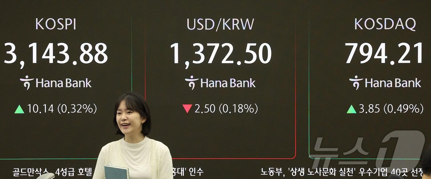 10일 오전 서울 중구 하나은행 딜링룸 전광판에 개장 시황이 나오고 있다. 이날 코스피는 전 거래일 대비 10.14포인트(0.32%) 오른 3,143.88, 코스닥은 3.85포인트(0.49%) 오른 794.21을나타내고 있다. 서울외환시장에서 원·달러 환율은 전 거래일 대비 2.50원 내린 1372.50원을 나타내고 있다. 2025.7.10/뉴스1 ⓒ News1 김진환 기자
