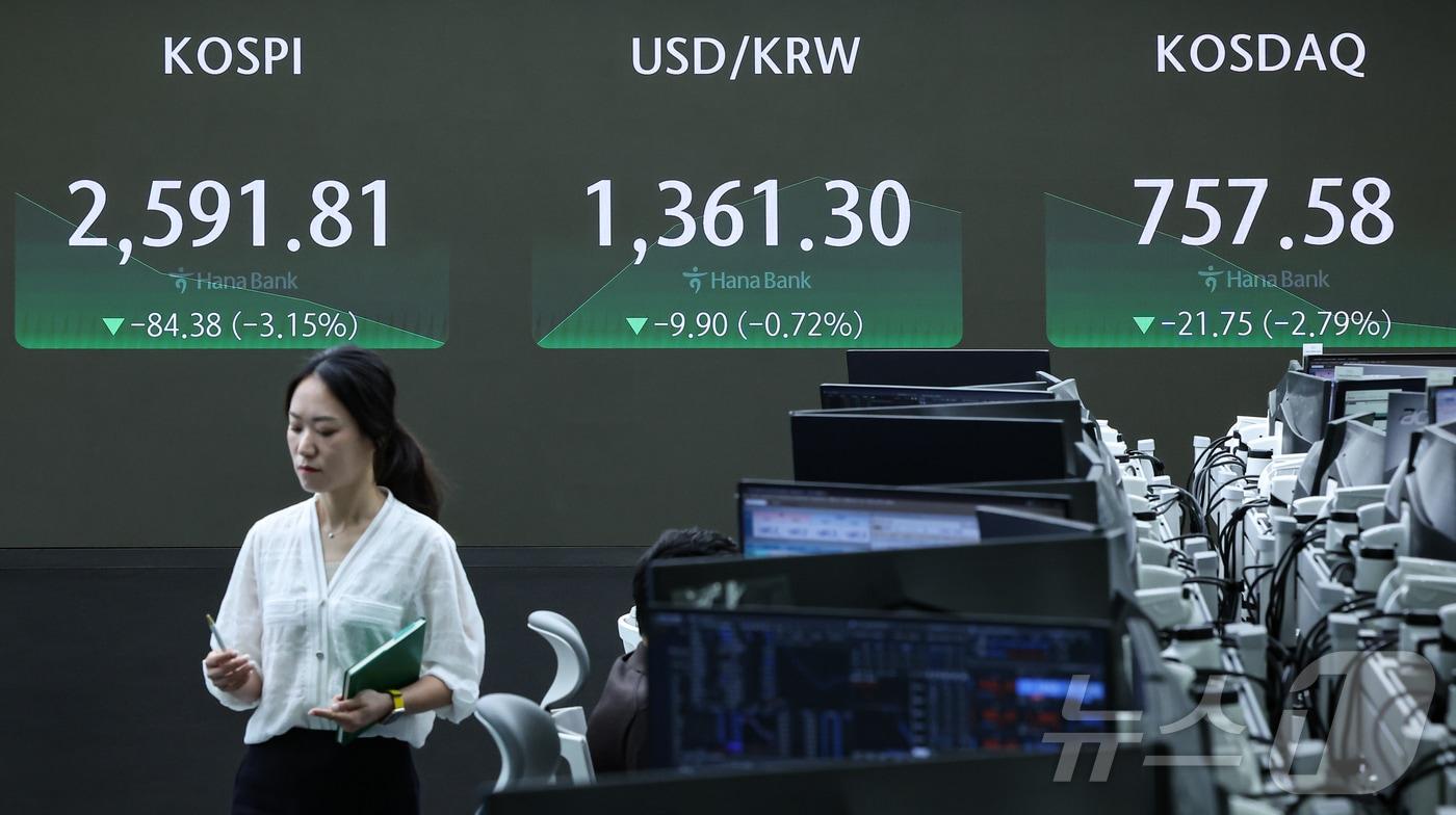 5일 오전 서울 중구 하나은행 본점 딜링룸 전광판에 개장 시황이 표시되고 있다. 5일 코스피는 전 거래일 보다 64.89포인트(2.42%) 하락한 2611.30, 코스닥 지수는 13.76포인트(1.77%) 하락한 765.57, 달러·원 환율은 전 거래일 보다 3.0원 오른 1359.0원으로 거래를 시작했다. 2024.8.5/뉴스1 ⓒ News1 김도우 기자