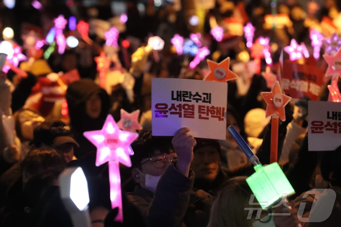 윤석열 대통령 탄핵소추안 표결을 하루 앞둔 13일 오후 6시 30분 울산 롯데백화점 앞 열린 촛불집회에서 응원봉을 든 시민들이 탄핵을 외치고 있다. 2024.12.13/뉴스1 ⓒ News1 김세은 기자