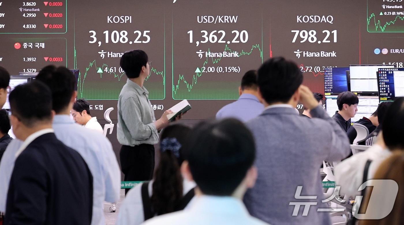 25일 서울 중구 하나은행 딜링룸 전광판에 코스피 종가가 표시되고 있다. 이날 코스피 지수는 전 거래일 대비 4.61p(0.15%) 오른 3108.25로 마감했다. 코스닥 지수는 전장보다 2.72p(0.34%) 내린 798.21로 거래를 마쳤다. 2025.6.25/뉴스1 ⓒ News1 박지혜 기자