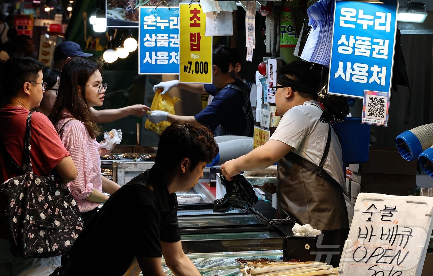 국회가 2차 추가경정예산안을 처리 예정인 4일 서울 마포구 망원시장에 온누리 상품권 사용 안내문이 게시돼 있다. 정부는 13조2000억원 규모의 '민생회복 소비쿠폰' 지원안과 6000억원 규모의 지역화폐(지역사랑상품권) 등이 포함된 추경안을 편성했다. 민생회복 소비쿠폰으로는 전 국민에게 1인당 15만~50만원을 차등 지급해 소비를 진작하고, 지역화폐로는 경제 활성화와 소상공인 지원에 나선다는 목표다. 2025.7.4/뉴스1 ⓒ News1 김도우 기자